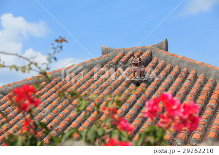 沖縄県 竹富島 琉球赤瓦屋根のシーサーとブーゲンビレアの花