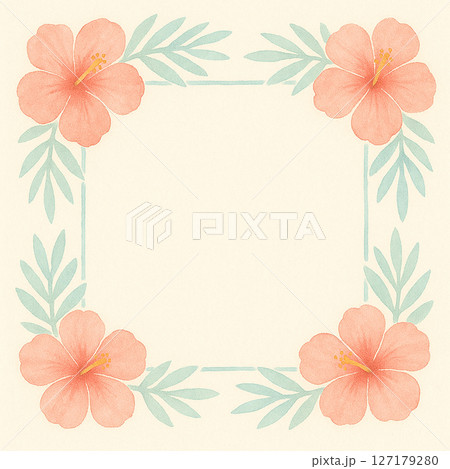 ハイビスカスの夏フレームイラスト(水彩・正方形・南国・余白あり)