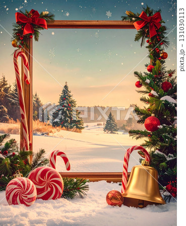 雪景色を背景にした夢のように甘いクリスマスオーナメントの飾り枠
