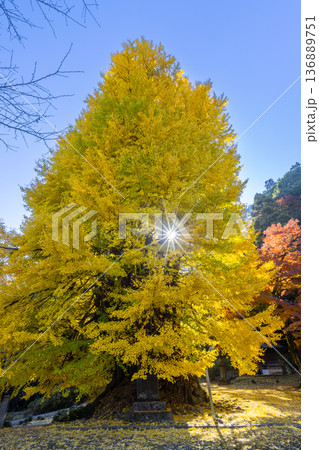 埼玉県東松山市岩殿 岩殿観音巌殿山正法寺観音堂前の黄葉した逆光の大イチョウと光芒