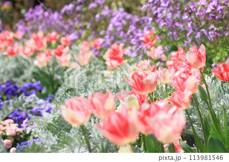 ウキウキする春の景色 満開のカラフルなチューリップ