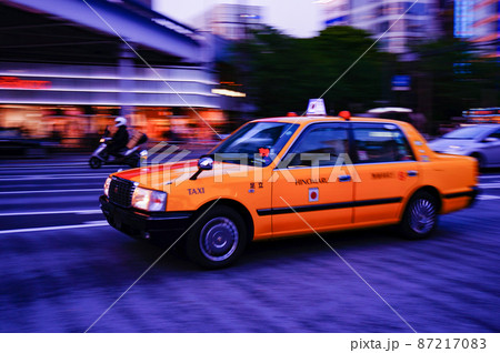 都会の夜を走り抜けるタクシーの流し撮り