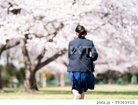 桜の木下駆け足の女子高生