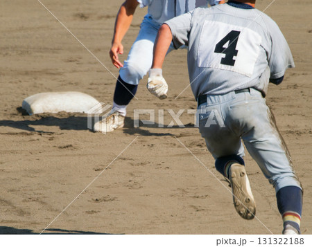 高校野球の試合で懸命に2塁へ向かう選手とタッチの準備をする選手