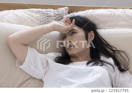 ベッドで頭を抱える女性