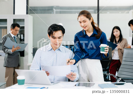 Asian business colleague business presents and explains and using laptop and tablet. Teamwork, financial marketing team,