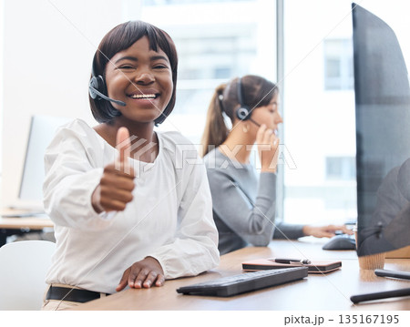 Thumbs up, woman with headset and on a computer desk in her office at work. Telemarketing or customer service, online communication or consultant and crm with African female person at workspace