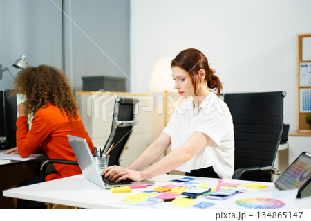 Two female fintech developers collaborating on finance apps, data analytics, and UI UX design in a high tech startup office