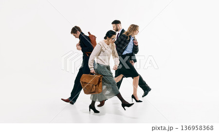 Four professionals walking in synchronized formation against white background.