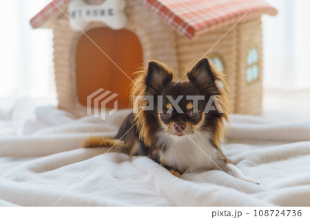 「MY HOME」の表札がある家の形のベッドの前でフセする犬