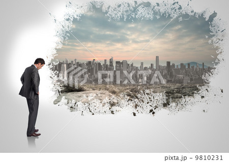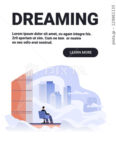 Dreaming business person looking at cityscape imagination clouds modern office window urban skyline abstract background website banner