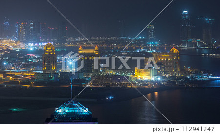 Aerial night view to Pearl-Qatar timelapse from top.