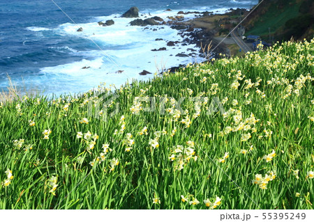 越前海岸 水仙の里 日本海と水仙の花