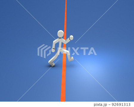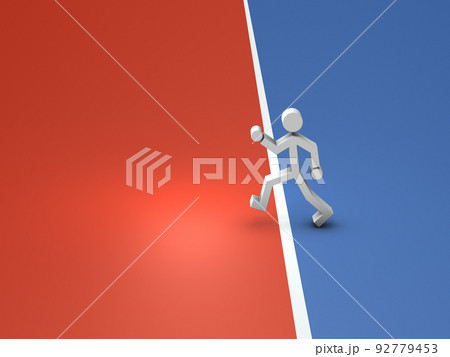 赤い境界線を跨いで、新しい世界に進入するキャラクター。挑戦とスタートを表す抽象的なコンセプト。