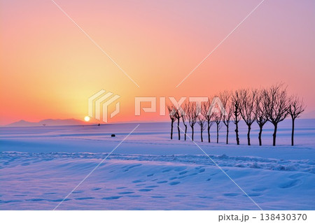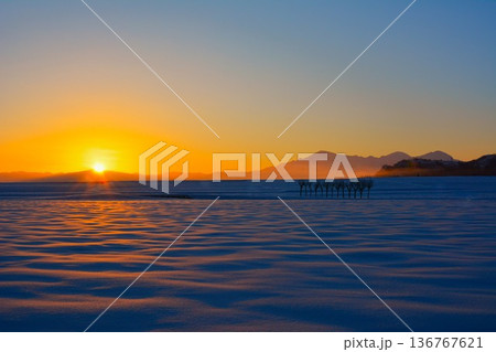 小千谷池ヶ原雪原のハサ木・朝焼けの夜明け