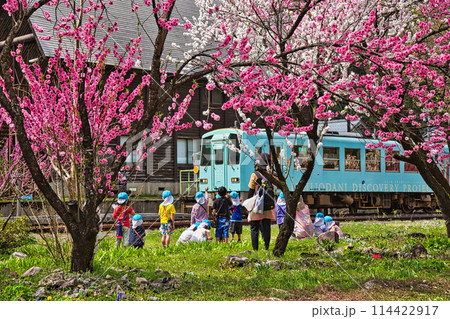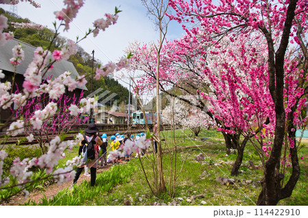 ハナモモの花が咲く勝原花桃の里と越美北線の列車