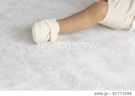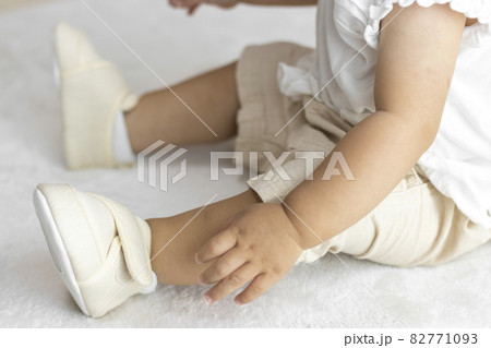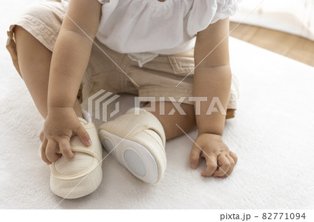 ベビーシューズを履いて、座っている赤ちゃんの足(1歳2か月、女の子、日本人)