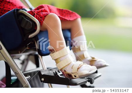 Disabled girl sitting in wheelchair. Close up photo of her legs spasticity muscles . Child cerebral palsy. Disability. Inclusion.
