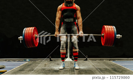 man powerlifter stand in front heaviest barbell at deadlift competition