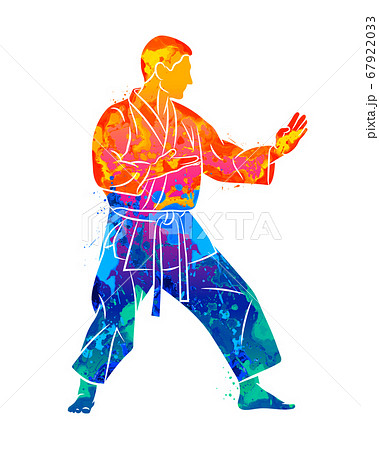 Abstract man in kimono training karate from splash of watercolors