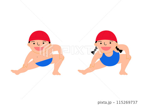 笑顔で準備運動をする水着の男の子と女の子 青キャップ 赤キャップ