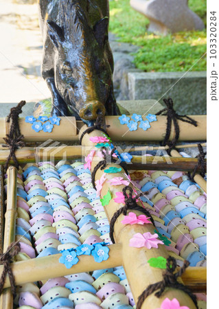 京都 護王神社 霊猪手水舎の手水に飾られているかわいい猪