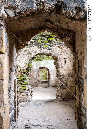 Nestled in Czechia, the Bezdez Castle ruins reveal ancient stone walls and arched passages, offering a glimpse into the historical architecture and serene landscape surrounding the site.