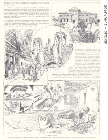 Historic Sarajevo Collage Featuring Streets, Mosque, Market Scene, and Daily Life in Vintage Illustration