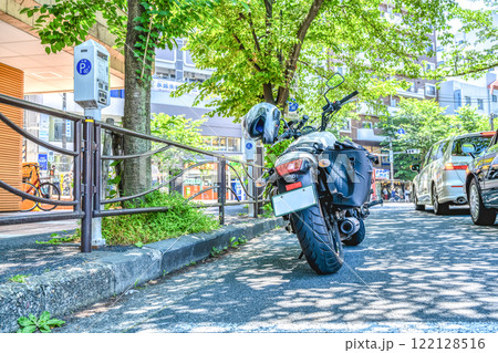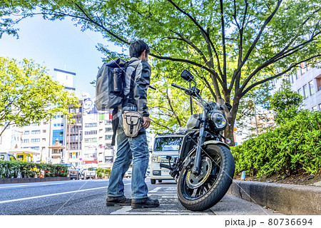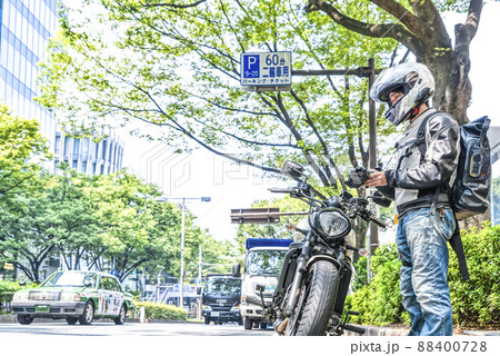東京ツーリング 表参道の路上駐車場にバイクを止めるライダーのイメージカット