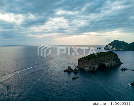 夕暮れのヒリゾ浜沖のドローン撮影。サンセットクルージングの漁船が航行している。ヒリゾ浜南伊豆町中木