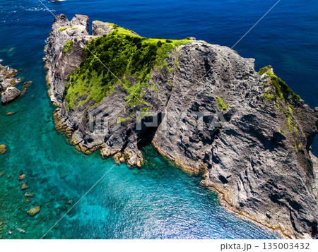 ヒリゾ浜のドローン撮影。大根島、あいあい岬、数々の地磯も見える。ヒリゾ浜南伊豆町中木 静岡県伊豆半島