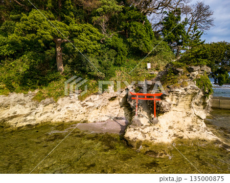 伊豆下田の竜宮島と白嶋神社の赤い鳥居。尾ヶ崎ウイングからドローン撮影。青い海と白い波濤、緑の林。