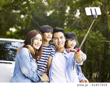 asian family with two children taking a selfie during a trip