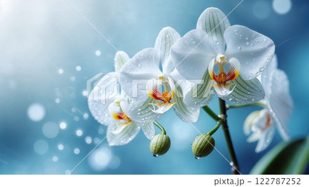 white orchids with dewdrops glistening under soft light, set against a serene blue background. Perfect for nature, beauty, and spa-related visuals