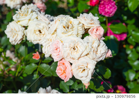 Wide shot of Carcassonne floribunda rose mass on clump, dense apricot blossoms and dark green glossy leaves under summer sun.