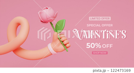Hand holding a pink rose with Valentine Day promotion and 50percent off offer 3D render illustration
