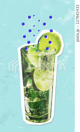 Cocktail collage with limes and bubbles on textured blue background for bar promotions