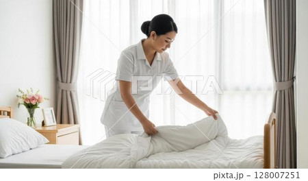 介護施設の個室でベッドメイキングをする女性ヘルパー