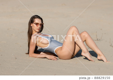 Attractive woman in sexy swimsuit relaxing on beach