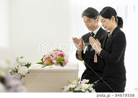 数珠を持って棺の前で手を合わせる喪服姿の男女