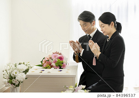 数珠を持って棺の前で手を合わせる喪服姿の男女