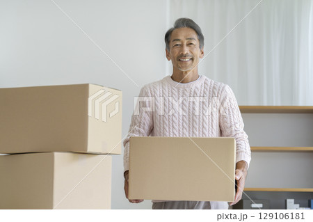 カメラ目線で笑顔のダンボール箱を持ったシニア男性 引越し・断捨離 イメージ