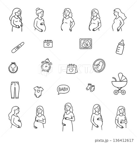 Vector illustration depicting various pregnancy stages and baby-related icons, including a pregnant woman, ultrasound, baby bottle, and stroller. Ideal for maternity and parenting themes.