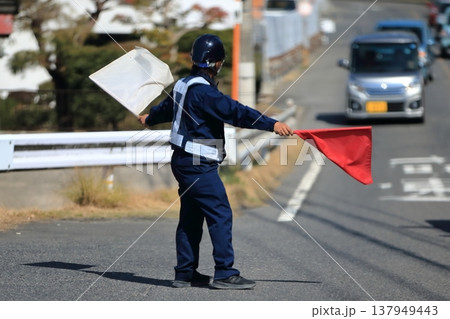 道路を走る自動車を誘導する交通誘導員