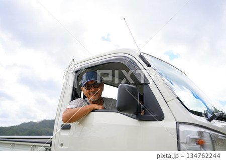 軽トラックに乗る笑顔の男性 【撮影協力:隠岐シーサイドリゾートみやび様】