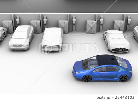 グレーシェーディングの駐車場に充電スポットを探している青色電気自動車