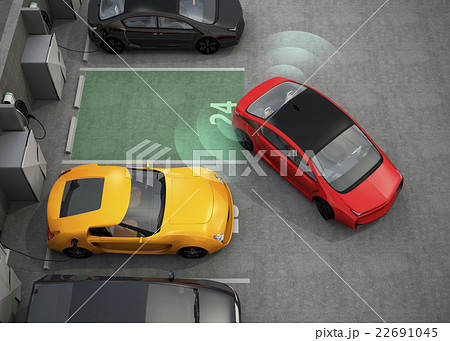 充電スタンドを備えた駐車場に自動駐車システムでバックする赤いクルマ