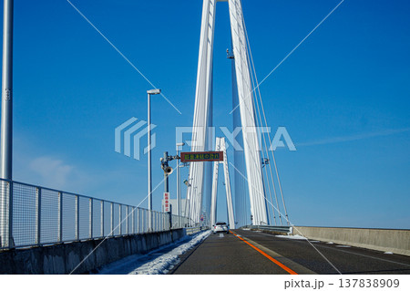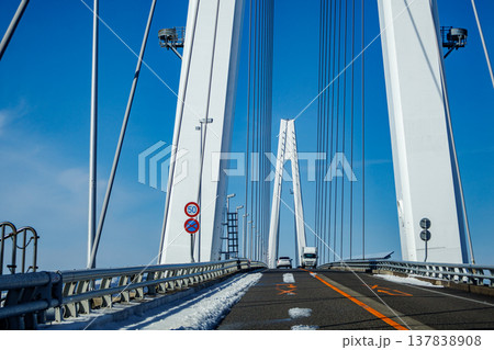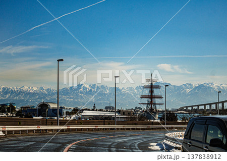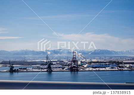 富山県新湊大橋の上から見た新港の風景