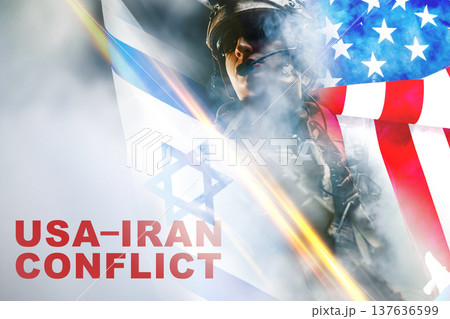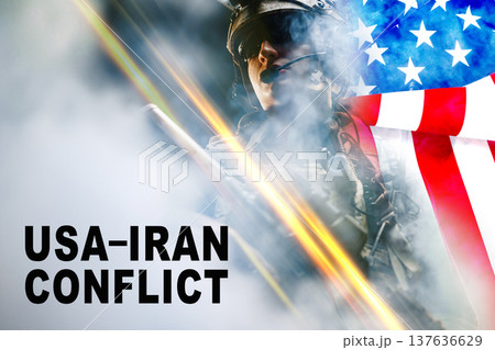 USA-Iran conflict represented through military and national symbols in a tense setting