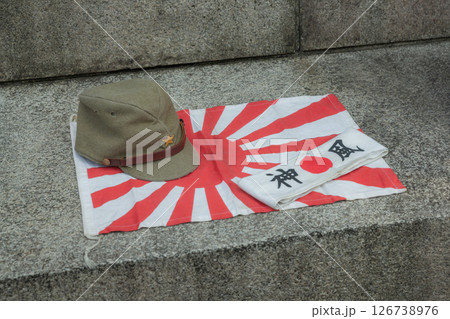 【日本】東京都千代田区の靖国神社に置かれた第二次大戦当時の旭日旗と軍帽、日の丸と神風の鉢巻